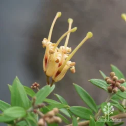 DESCRIPTION: Native scrambler/climber covered with white pea shaped flowers in spring and winter each with a tiny pea-green centre. Leaves are usually long and slender, but can be wider when juvenile. Much longer flowering stems than White Out, up to 25cm.